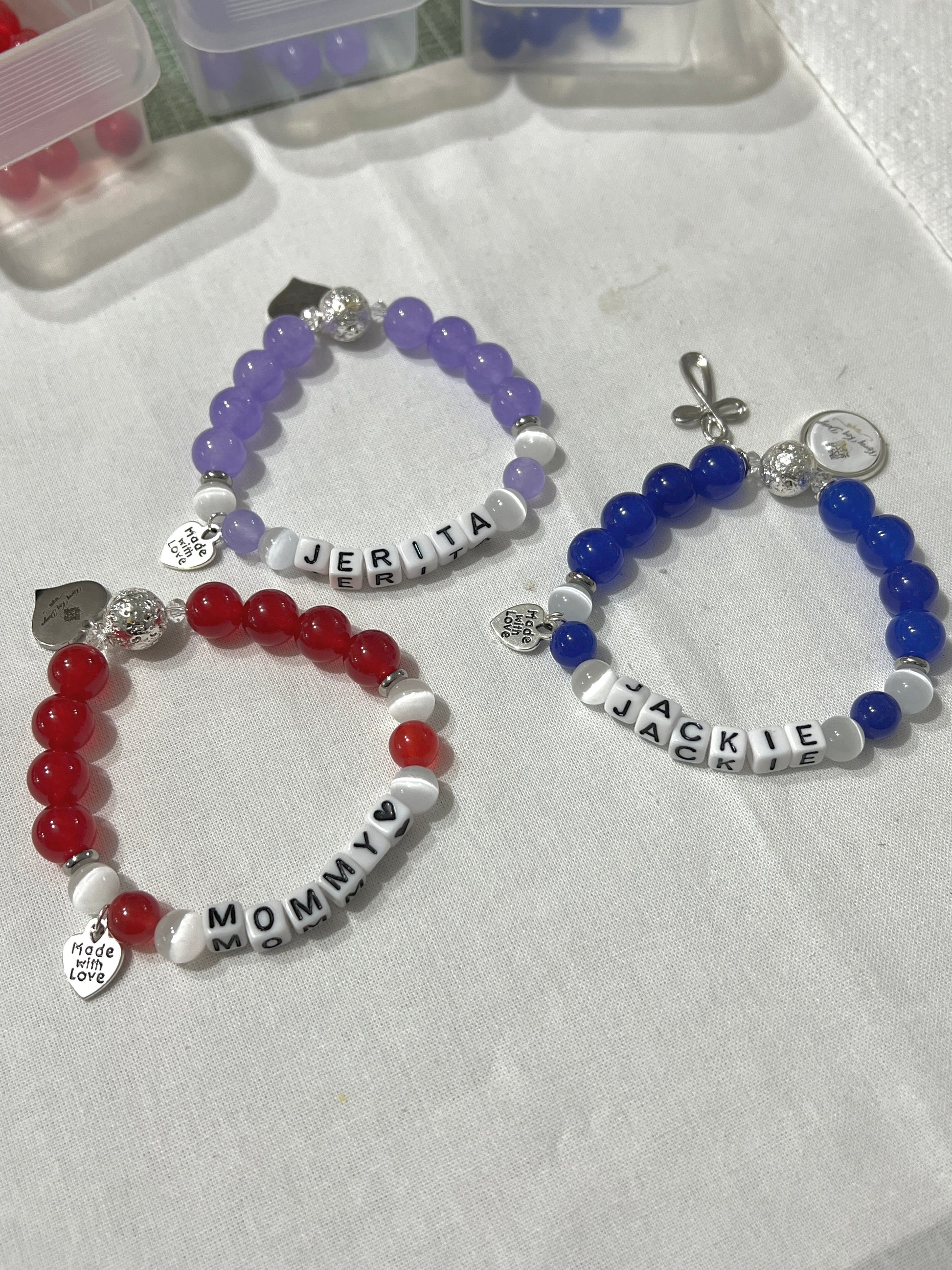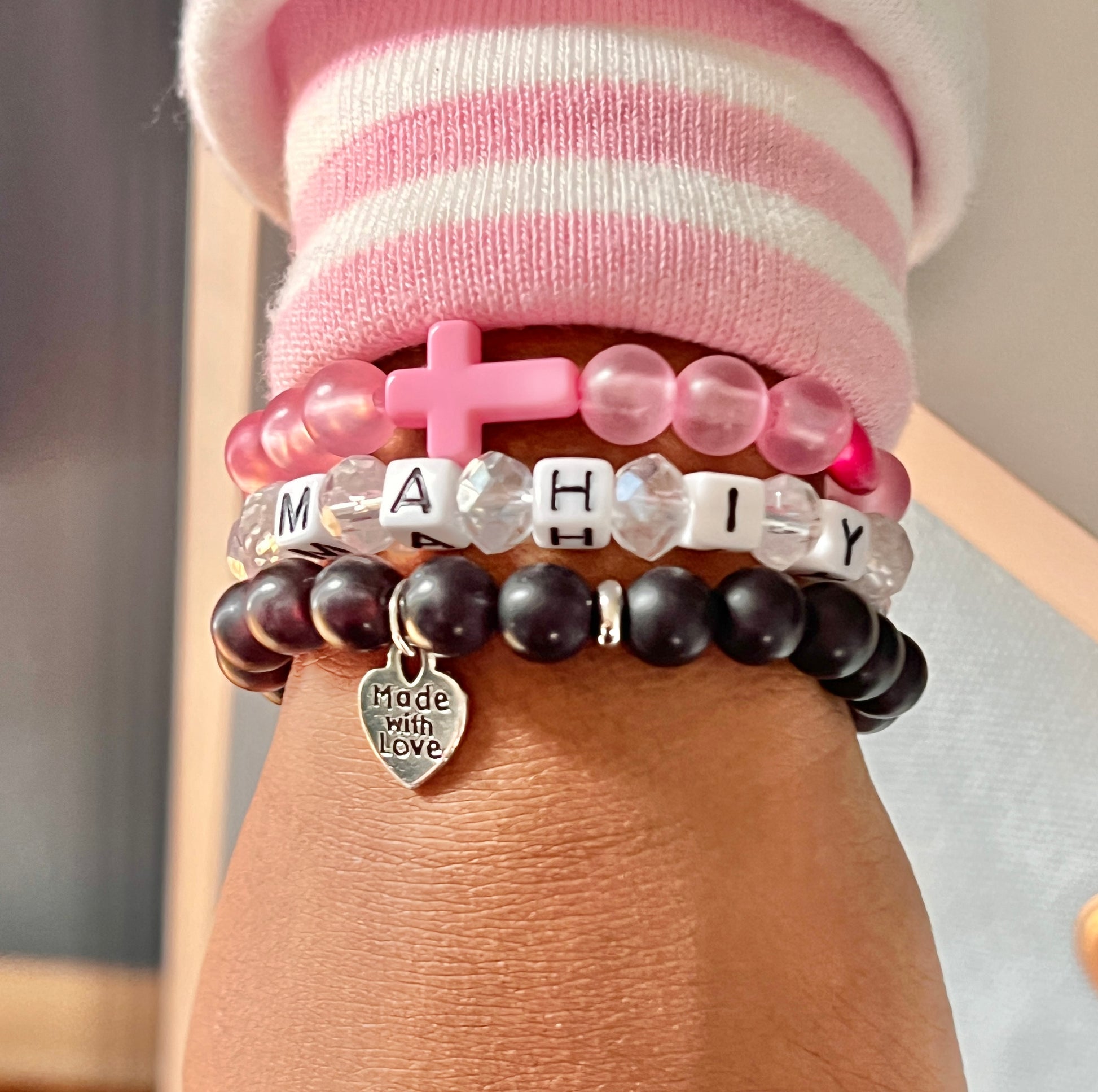 ✨ THIS LISTING IS FOR ONLY ONE BRACELET, IF YOU WANT A STACKED LOOKED WITH THREE BRACELETS YOU MUST ADD 3 BRACELETS TO YOUR CART. THERE IS A NOTES AREA ON THE CHECKOUT PAGE, JUST LET ME KNOW IF ITS FOR ONE CHILD, SO I CAN CREATE COMPLIMENTING PIECES. IF ITS FOR 3 DIFFERENT CHILDREN, ADD 3 DIFFERENT NAMES AND THE COLOR YOU WANT IN NOTES AREA. THANK YOU